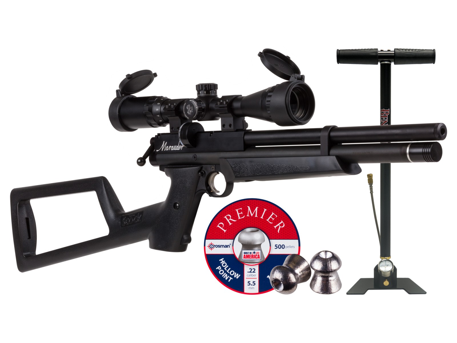 Benjamin Marauder PCP Air Pistol Kit 0.22. Benjamin Marauder pistol Precharged pneumatic (PCP) Bolt-action 8-rd circular mag with auto-indexing 11mm dovetail Integral shroud makes this a VERY quiet gun 12" choked barrel delivers superior accuracy Raised aluminum breech for easier loading of the clip 2-stage adjustable match trigger…and the trigger is heat-treated metal! 1.53 lbs. trigger-pull 29.75" overall length with stock 18" overall length without stock 15.75" length of pull Uses 2,900 psi compressed air Built-in pressure gauge Air tank has a quick-disconnect male Foster fitting 65cc (4 cu in) reservoir Reversible bolt — switch from right to left side (with our special service) Ideal for hunting small quarry up to 33 yds away No open sights, so you'll need a scope or dot sight Marauder pistol clips are not interchangeable with the Marauder rifle clips…and vice versa Includes UTG 3-9×32 AO Rifle Scope, 1" rings, Benjamin Hand Pump, one mag, shoulder stock extension and 500 Crosman Premier 14.3 Grains Hollowpoint pellets. Sale Price: 629.95 USD. SKU: 819024019055. Brand: Benjamin. Color: Black. Product Category: Air pistols.